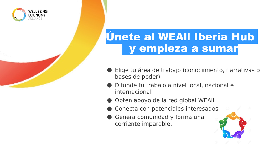 WEAll Iberia es un punto de encuentro entre personas, organizaciones, instituciones y empresas interesadas en promover una economía del Bien-Estar en Portugal y España. Más