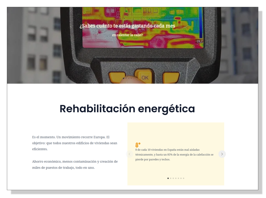 En paralelo, hemos montado una plataforma divulgativa, centrada en una página web que contiene información resumida del concepto de rehabilitación energética, dirigida a todos los públicos. Y con enlaces para obtener más información, y contactar con las diferentes redes, plataformas y organizaciones en el Estado Español, a quienes acudir para conseguir ayuda.